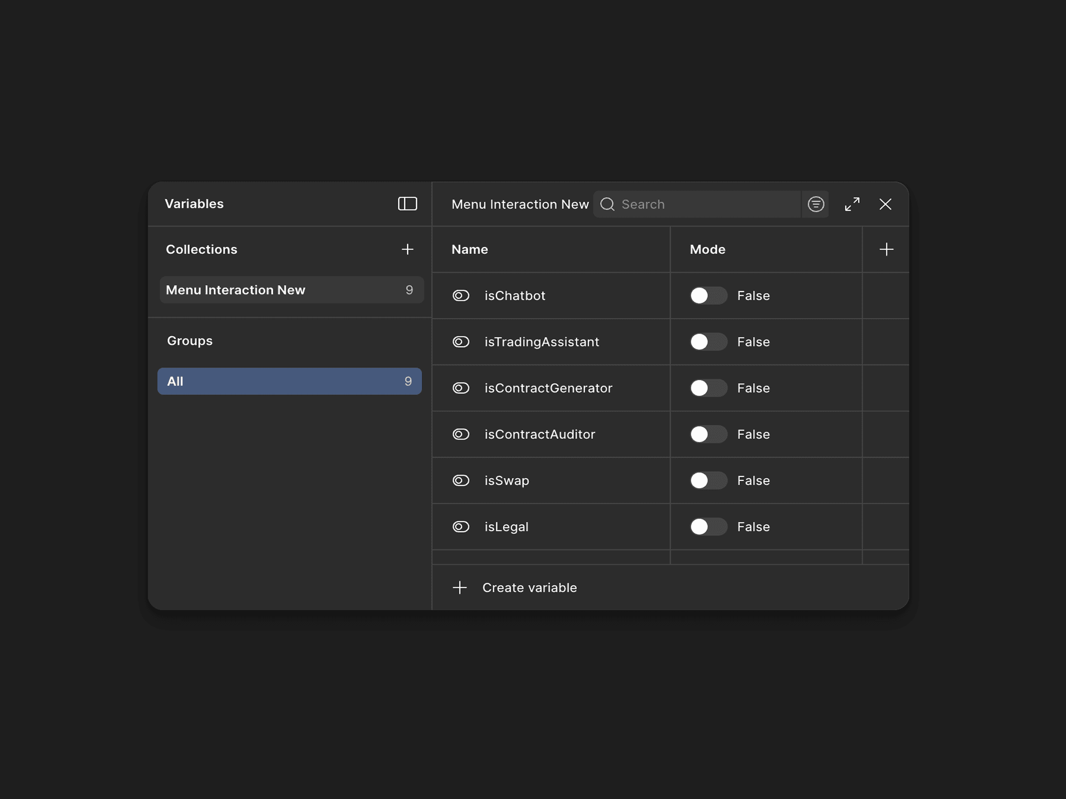 To support smooth and consistent transitions between tools in V2.2, navigation was designed in Figma as a state-based system using variables and conditional logic.